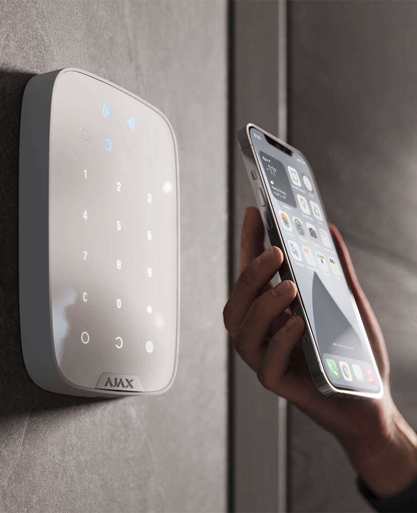 De AJAX KeyPad Plus met RFID lezer draadloos bedieningspaneel voor uw AJAX alarmsysteem, ideaal voor bij de entree van het pand. U heeft de mogelijkheid om meerdere codes in te stellen en u schakelt het AJAX alarmsysteem eenvoudig in of uit met de RFID kaart en/of tag.